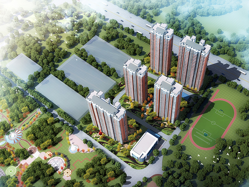 平安四季城项目位于经济开发区北海路与泰祥街交汇处,项目总占地面积20157㎡,总建筑面积99980㎡,由2栋办公楼和4栋26+1的高层住宅组成,采用围合式布局,楼间距52米,绿化率45%。